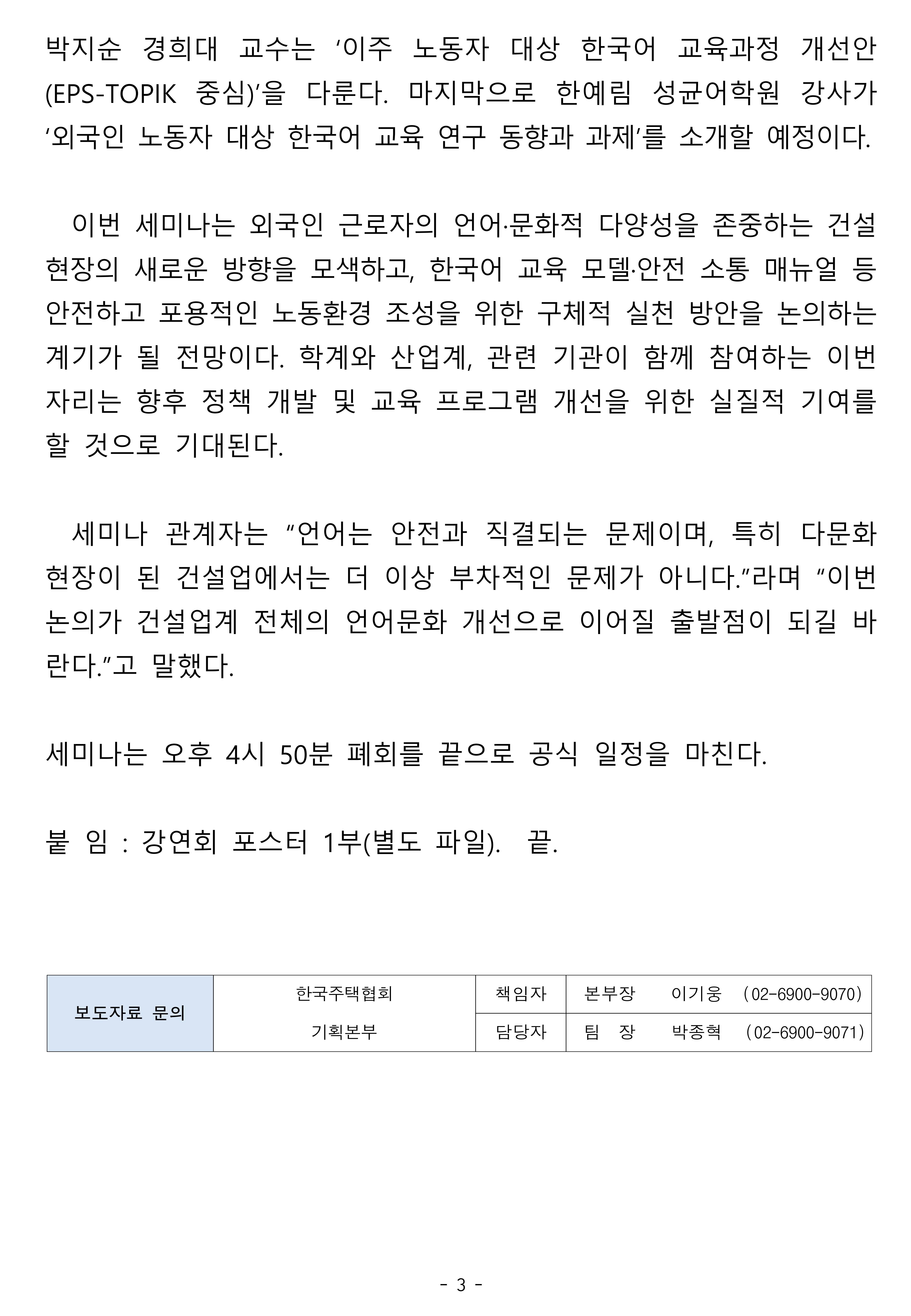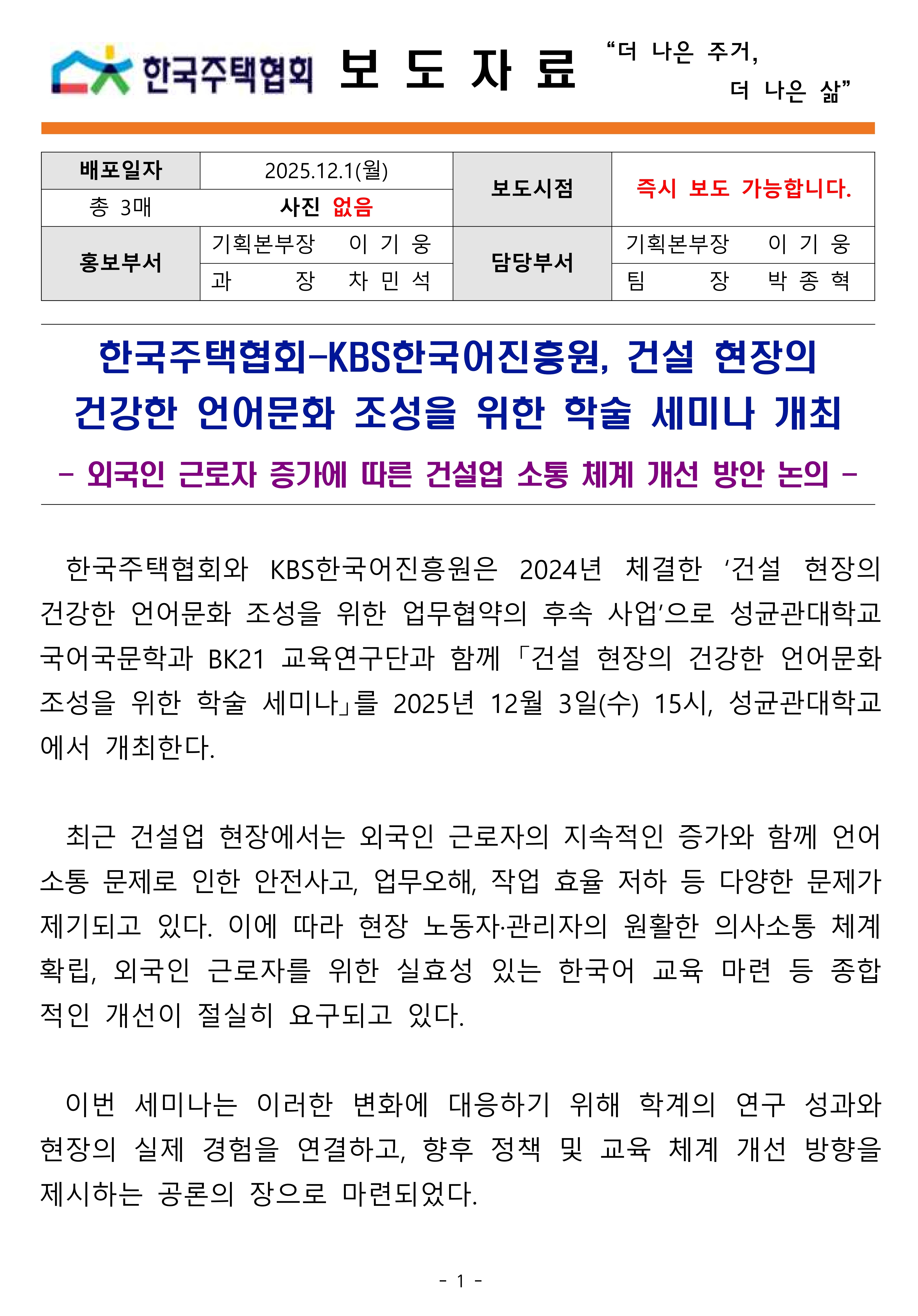 [보도자료] 한국주택협회-KBS한국어진흥원, 건설 현장의 건강한 언어문화 조성을 위한 학술 세미나 개최.hwp
