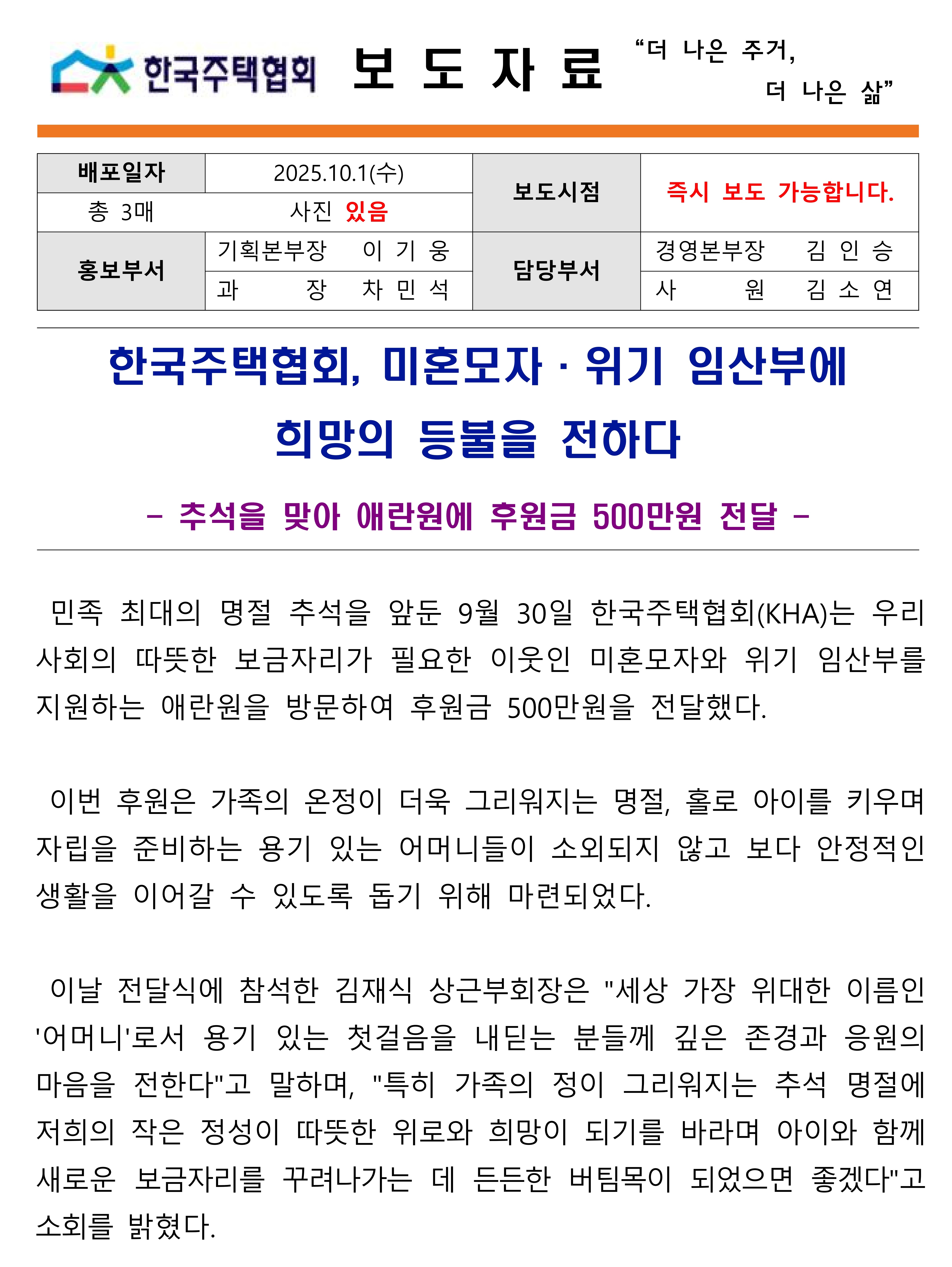 [보도자료] 한국주택협회, 미혼모자·위기 임산부에 희망의 등불을 전하다.hwp