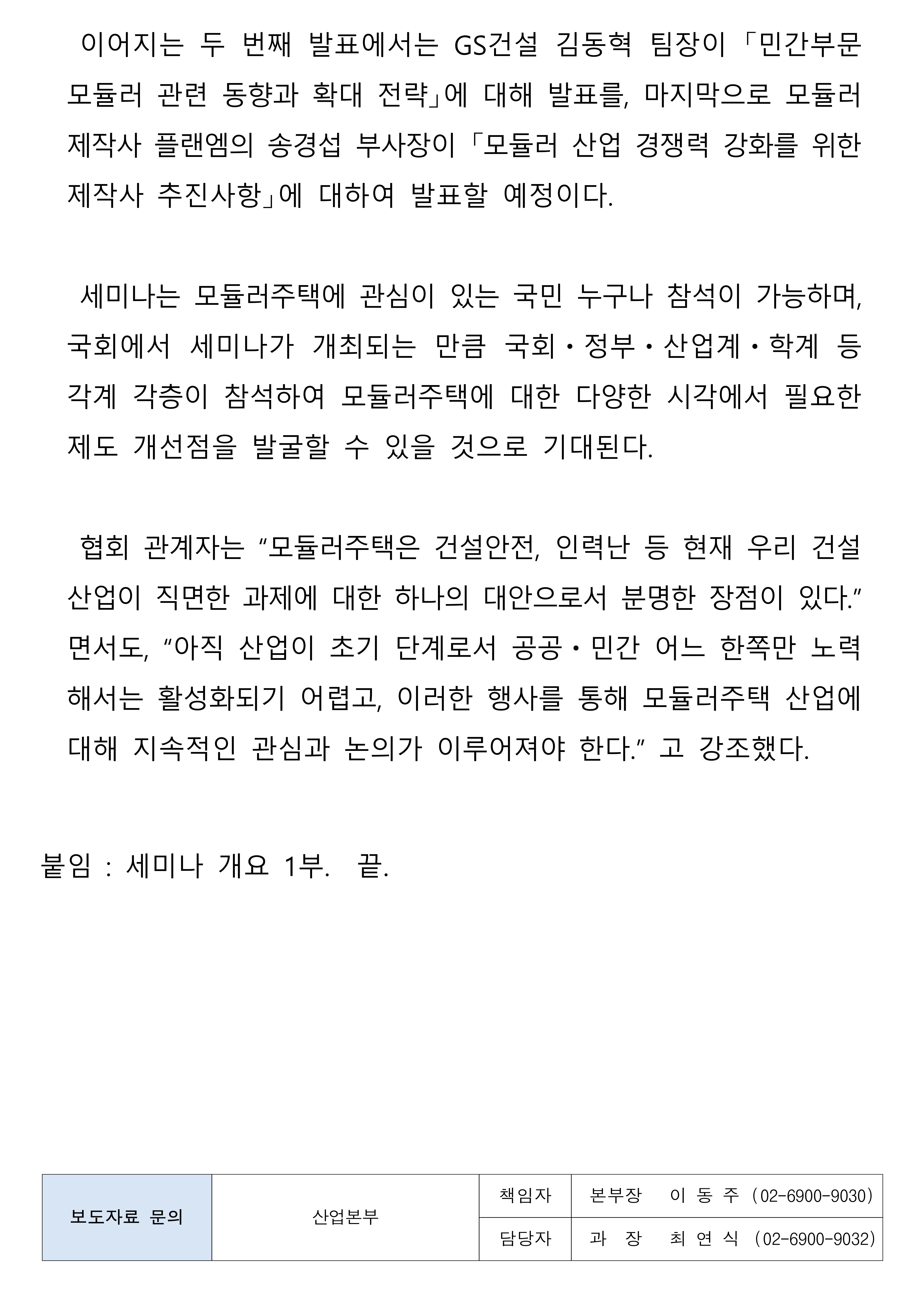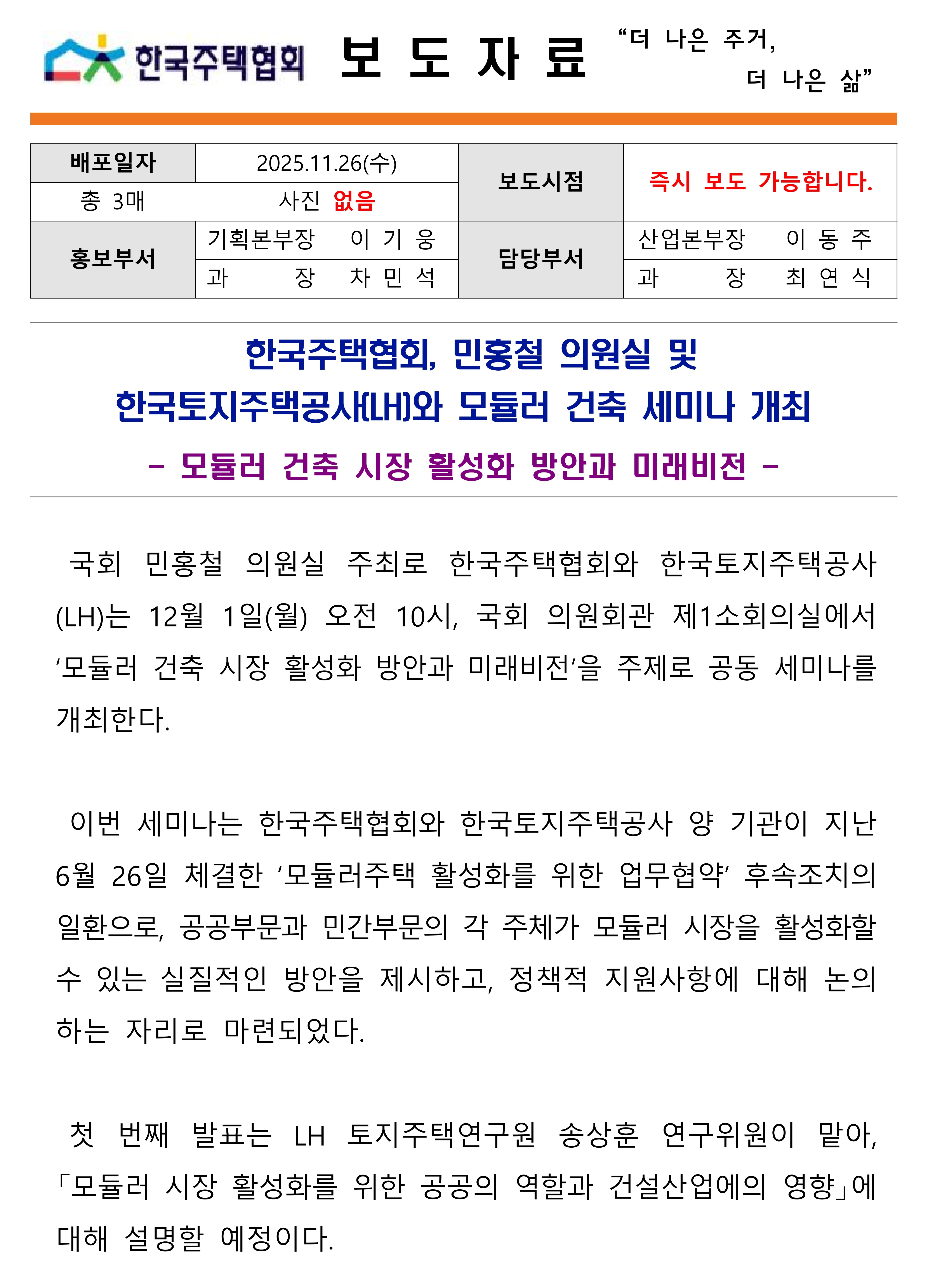 [보도자료] 한국주택협회, 민홍철 의원실 및 LH와 모듈러 건축 세미나 개최.hwp