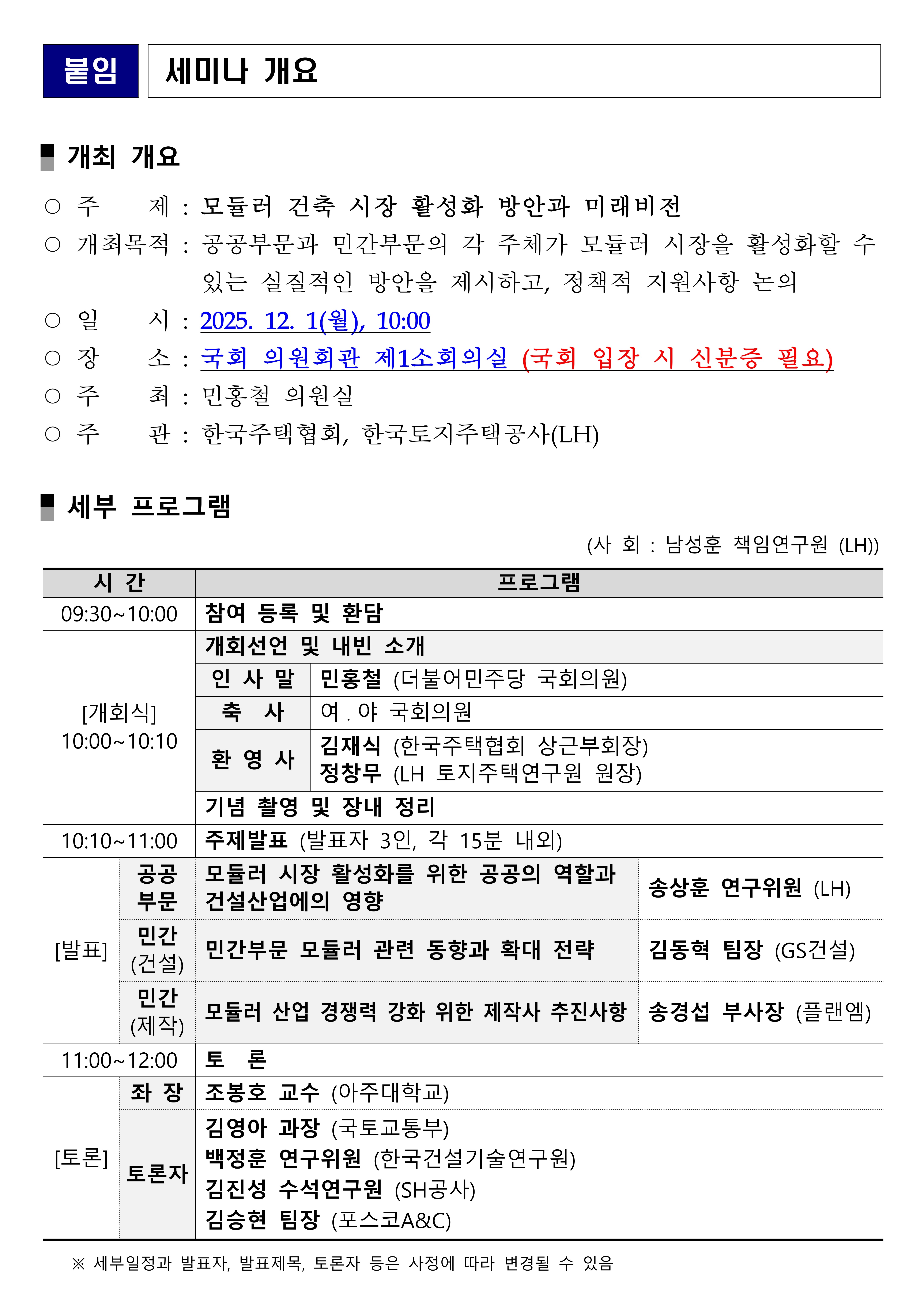 타이틀 : 한국주택협회, 민홍철 의원실 및 LH와 모듈러 건축 세미나 개최