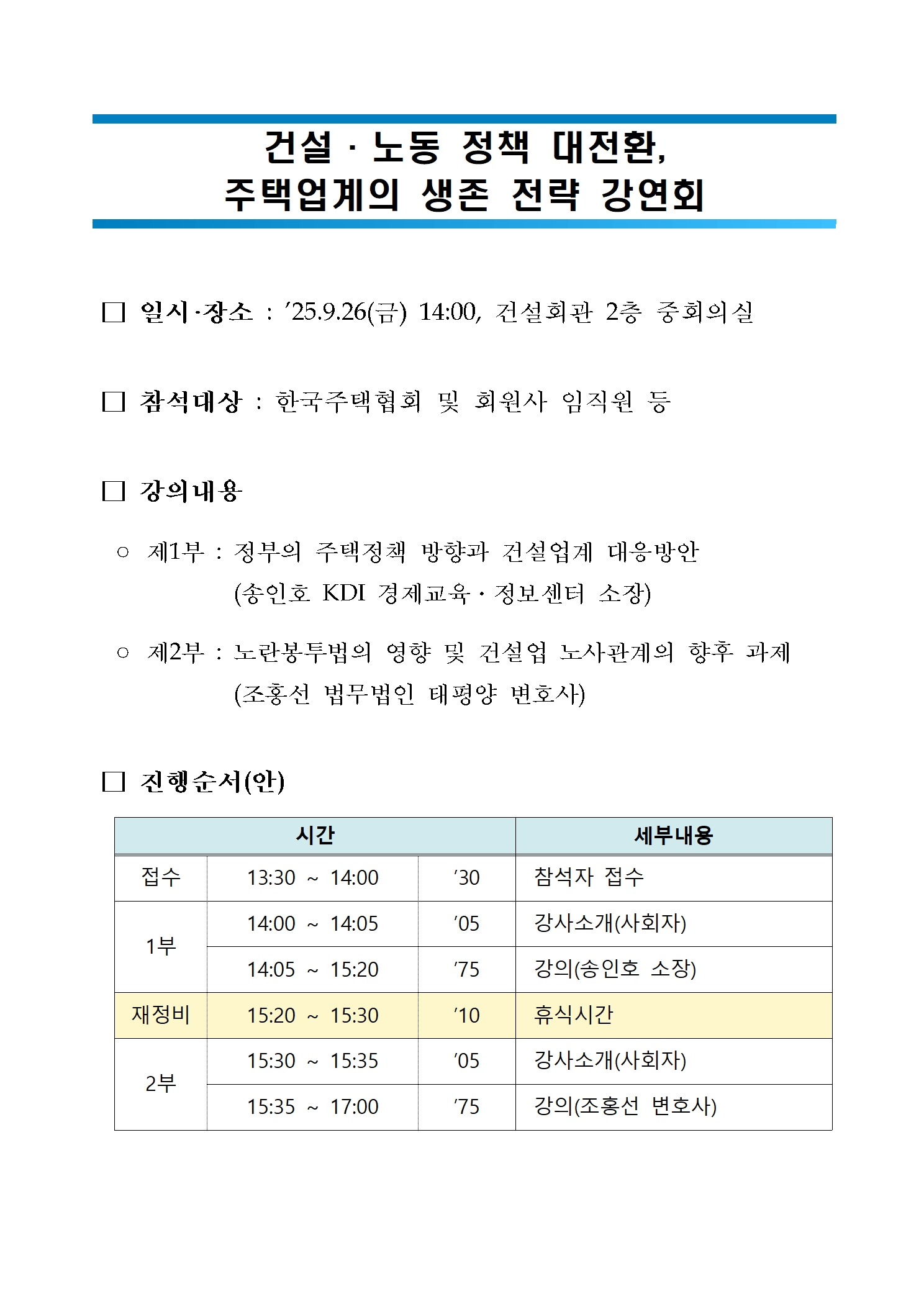 타이틀 : 건설·노동 정책 대전환, 주택업계의 생존 전략 강연회 개최 안내